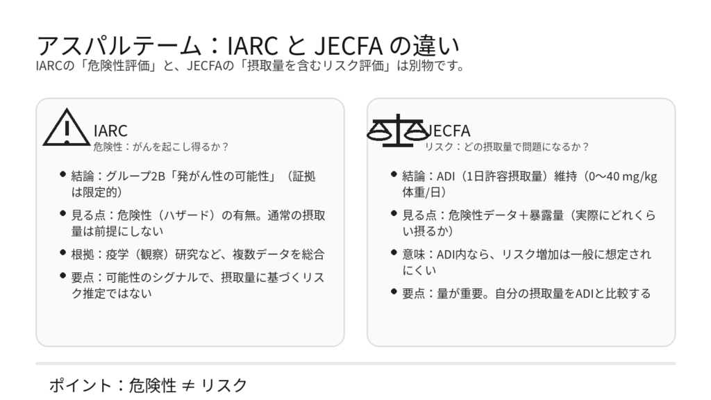 実際、WHO傘下のIARCはアスパルテームを「グループ2B(ヒトに対して発がん性の可能性)」と分類しました。一方で、同じくWHO/FAOのJECFAは、評価の結果としてADI(1日許容摂取量)0–40 mg/kg体重/日を維持しています。
