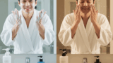 • ぬるま湯で軽く予洗い→低刺激の泡タイプ洗顔料でやさしく洗う。テカリが気になるTゾーンは丁寧に、乾燥しやすい頬はこすりすぎない。