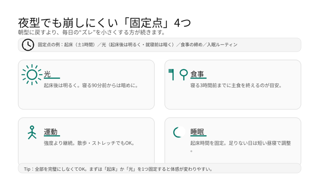 ここでは「朝型に戻す」ではなく、夜型のまま 乱れを最小化するための方法をまとめます。